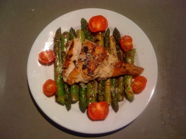 Pan-fried Barramundi on a bed of Grilled Asparagus and Organic Tomatoes. Took me 12 minutes from opening the door of the fridge to having it photo ready on my plate. Simple!