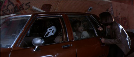 As was mentioned earlier, the suspense set pieces in the Scream movies work because they’re both ingenious and they play with the audiences knowledge of genre conventions. And none works better than this tense sequence towards the end of Scream 2. When Sidney and Halle find themselves trapped in the back of a police vehicle with an unconscious Ghostface in the drivers seats, they take all the logical steps to escape. They try to break the windshield, the try to jimmy the door, etc. Slowly but surely, it becomes apparent that the only way out is crawly through the front seat and over the passed out masked serial killer. Too many horror movies wring cheap thrills out of unrealistic and contrived set ups. By clearly delineating each obstacle as the scene progressed and showing the characters train of thought, they created one of the most breathtakingly suspenseful sequences in modern horror movie history.