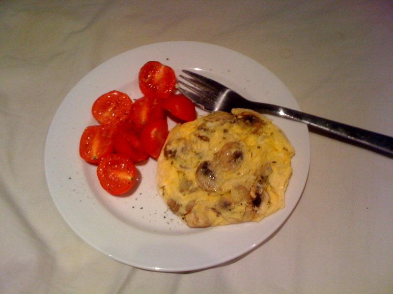 * You don’t really need anything but the eggs and maybe some salt and pepper, so you could add / subsitute Sliced Chicken or Ham (HAYM) for the Mushrooms for example. Same for the Cherry Tomatoes.
