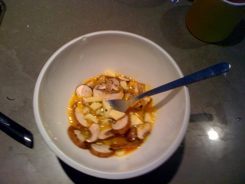 STEP TWO – Add Sliced Mushrooms and crumble the Cheddar over it. Stir for literally a second or two to mix it in. You should have THIS :-