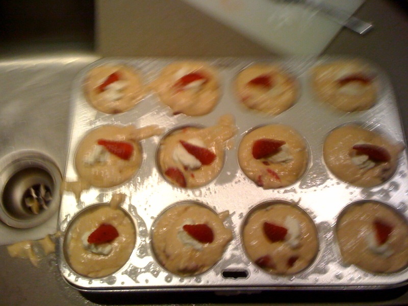 Lightly oil up Muffin Tray and fill up a dozen muffins. Dot top of each with remaining Ricotta and garnish with Strawberry. You can sprinkle with sugar if you want, depends on how close of friend you are with your waistline at this point in your life.