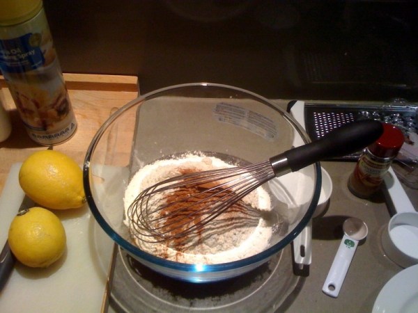 Sift Flour and Cinnamon into a Bowl and stir in the Castor Sugar. The recipe calls for you to sieve the flour but, if you’re like me and for some reason never got around to buying a sieve, a find a whisk is a handy alternative.