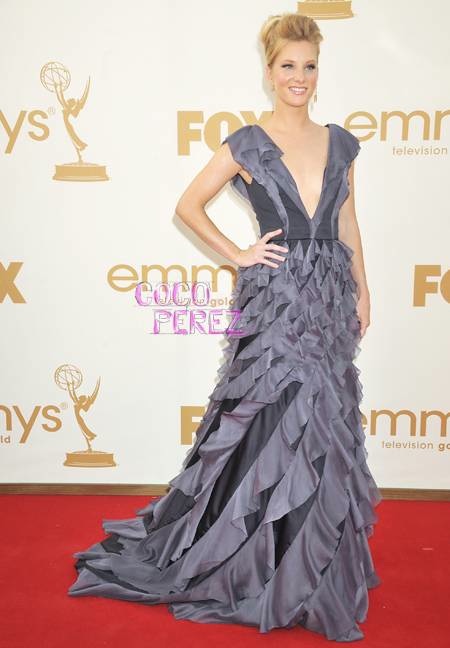 Little Brittany S Pierce is all grown up! Lea Michele and Dianna Agron got all the attention on the night, but this is one of the two Glee fashion highlights in my opinion. Very few women can pull off gun metal grey and HeMo does it with aplomb. Same goes for the ruffles, this dress is worn so elegant and gracefully while still being very much individual and fashion forward.
